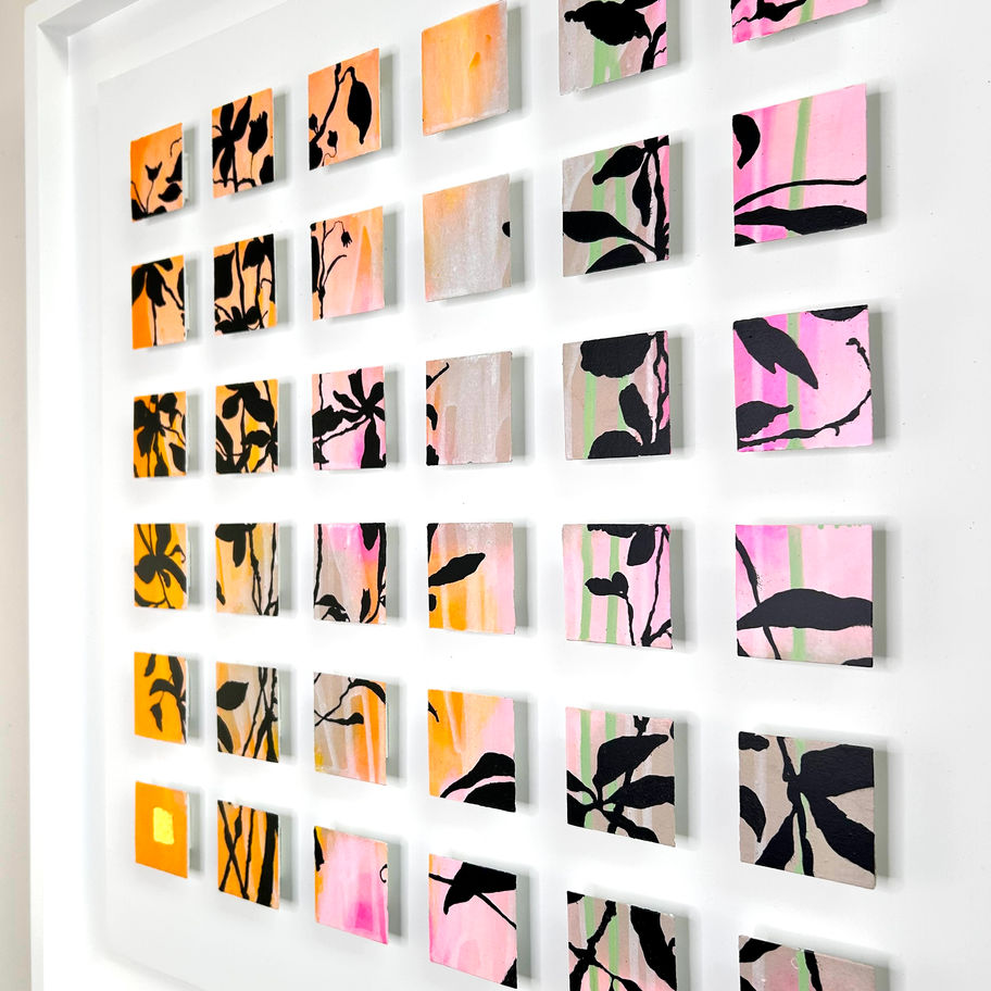 Mixed Media on a deep-edged 12 x 12 x 3cm board / square block in a bespoke white tray frame, measuring 22 x 22 x 5cm.