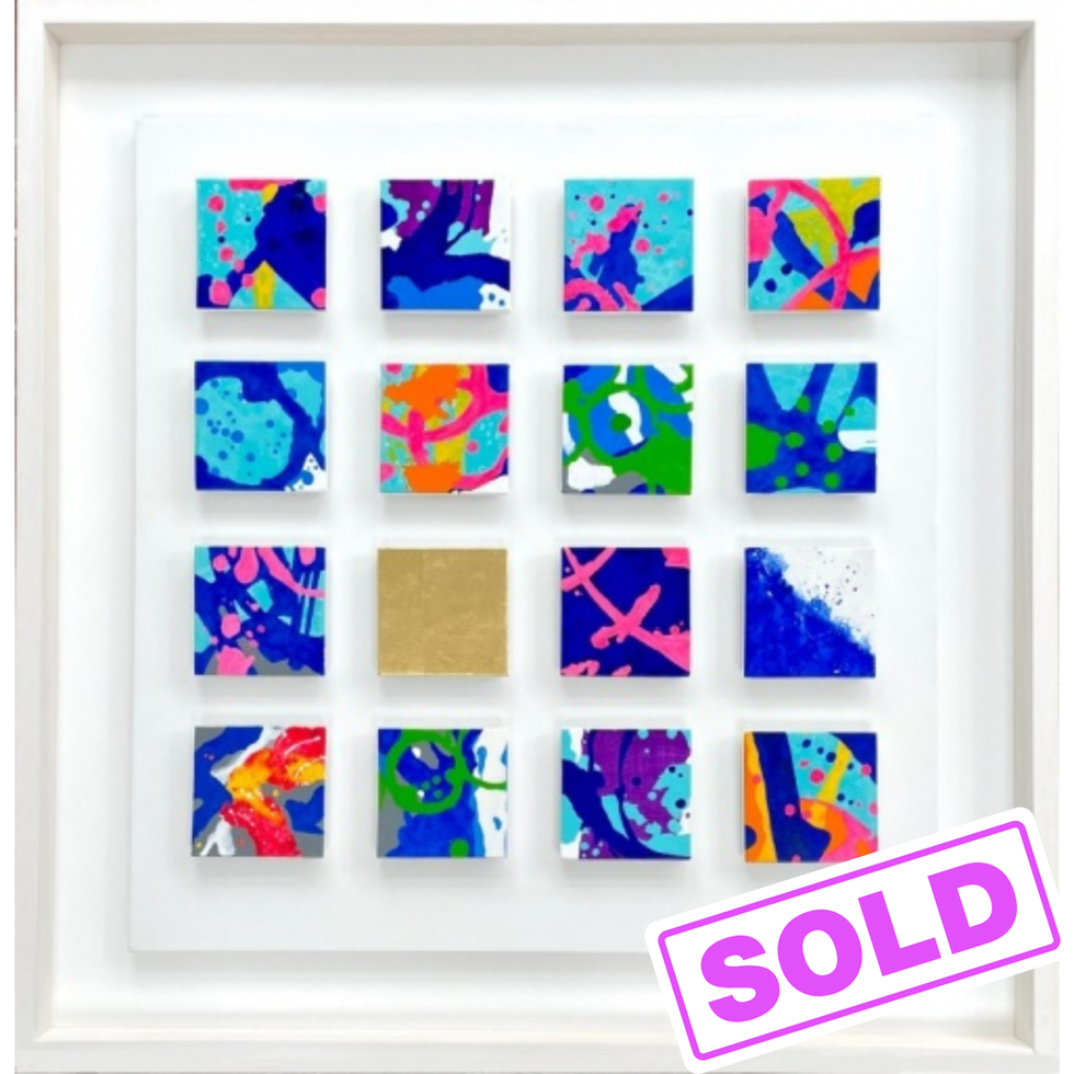 Mixed Media on sixteen 12 x 12 x 3cm boards / square blocks on a panel in a bespoke white tray frame, measuring 90 x 92cm.